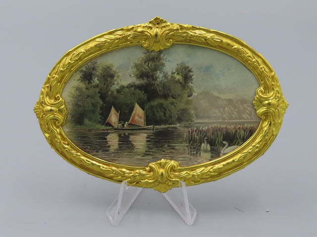 The ormolu on the frame is just as gold as it can be! The scene is a lake with