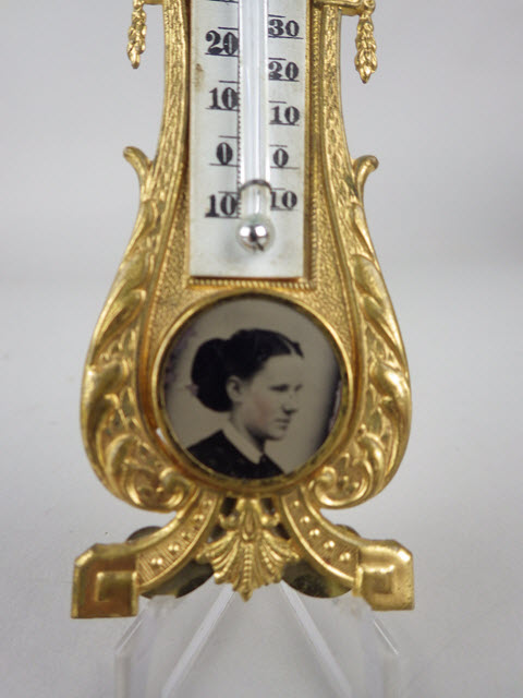 This ormolu thermometer has lovely scroll work at the top with fish heads on the sides. The borders on the sides of the thermometer become more extravagant with heavier scrollwork that frame the circular portrait of a lady. This piece balances on two feet and is held up in the back by a large support stick.