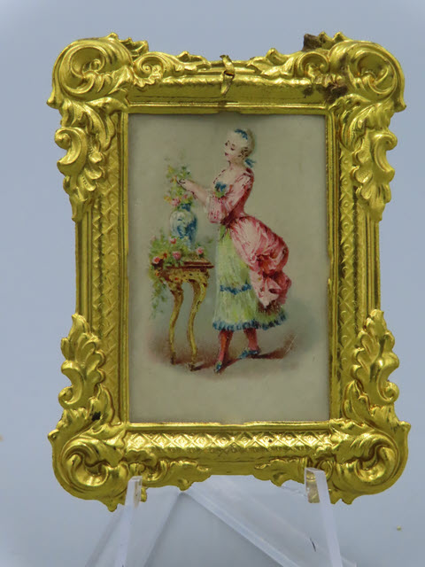 This picture shows a lady dressed in a highly fashionable gown with a bustle in pink and a long skirt in blue. She is arranging flowers in a vase. The ormolu frame has scroll work in the corners.