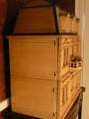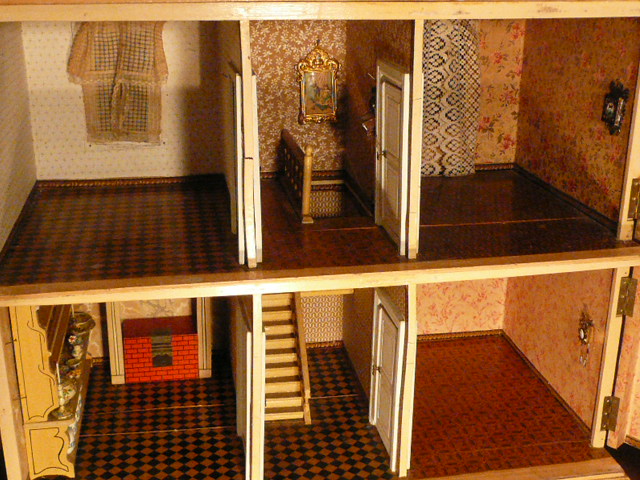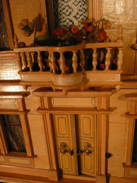 This Christian Hacker's Dolls' House is in excellent condition with its original paint and wallpapers. The exterior is painted a soft golden color with the trim work a few shades darker. All of the window treatment and painted decoration is as clear as if it were new. The raised quoining, painted lined windows, the original mansard papered roof, double door entrance with ormolu door knockers, the original curved balcony -are all intact. House opens from the front to reveal 4 main rooms and two halls with a staircase and railing. The 3rd story is removable and contains two rooms with original wall and floor papers. The main part of the house has all its original wall and floor papers, original curtains with papered borders over each wooden bracket, painted ceiling medallions, and inter-connecting doors with butterfly knobs making it possible to lock each door. Kitchen has a built in stove unit (stove is a block of wood with red brick paper) and a wonderful cupboard to display dishes. The house retains its original chimneys too. Measurements: 37"h. x 31"w.x 16-1/2"d. Circa: 1880 Price: SOLD For further information, please email me at -antiquedh@comcast.net |
