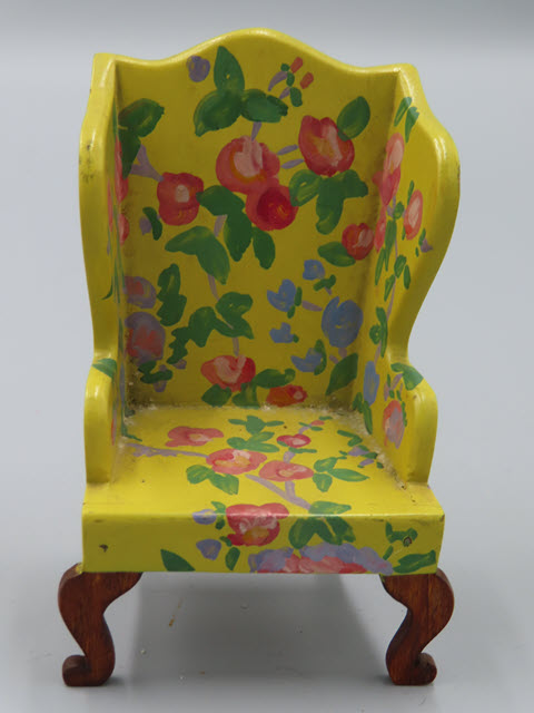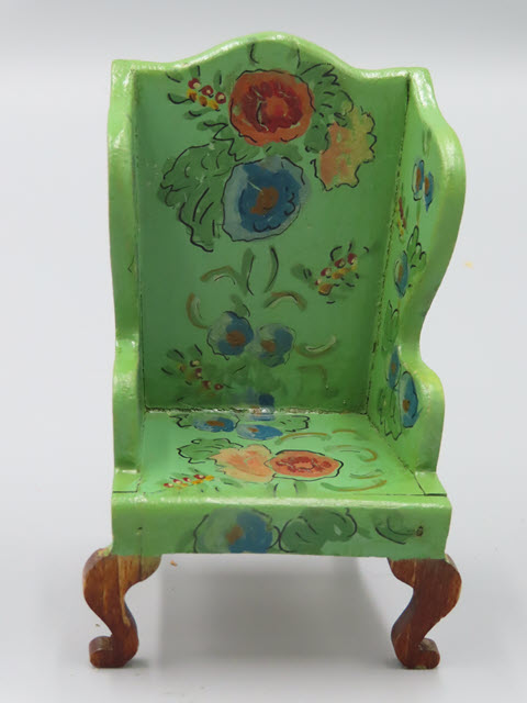 Tynietoy Wing Chairs All the wing chairs are the same but with different flower designs. Measurements: 4-1/2"h. x 2-5/8"w. Circa: 1920 Price: $150 each, the green wing chair has SOLD!