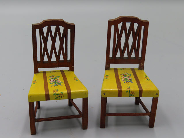 These two Sheraton Tynietoy chairs have exceptional painting on them. The center stripe has tiny pretty flowers painted in a bouquet. Single flowers are on the outer stripes! Beautiful chairs!