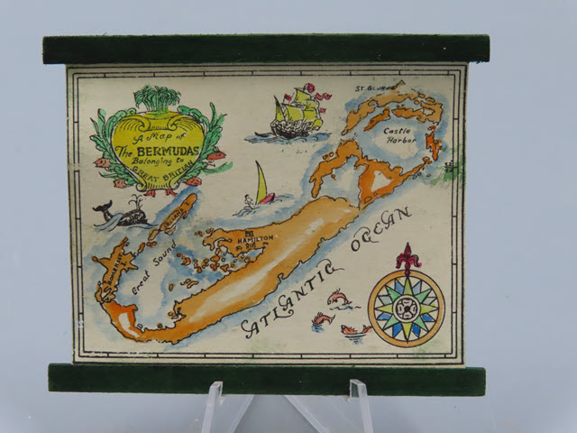 A Map of Bermuda A colorful map of Bermuda! Wooden borders at the top and bottom of the map help to hang this map on a wall! There is a tab on the back for easy hanging! Measurements: 2-3/4"h. x 3-3/8"w. Circa: 1920's Price: $75