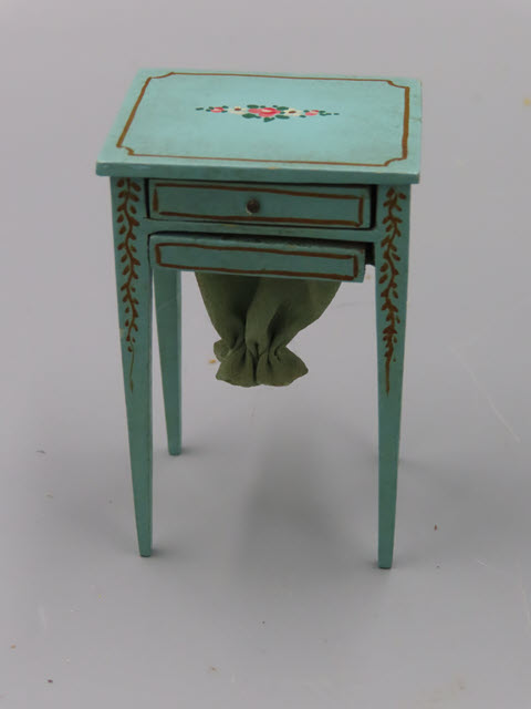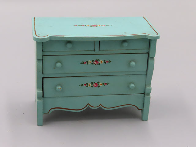 The color of this bedroom set is very pretty!! I don't remember seeing this color before. The set consists of a single bed, a bureau, a rocker and a great sewing stand that is all original. (Note: You will see two drawers that pull out in the front of the stand. The bottom drawer has a hole cut out with the bag for sewing hanging down from it.). The set is in mint condition. Small groups of painted flowers appear on all four pieces! There is also a gold outline on all the parts of the furniture. This is being offered as a set.