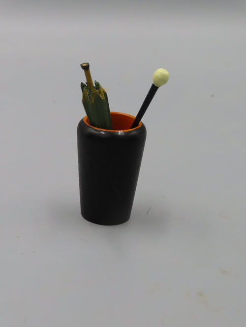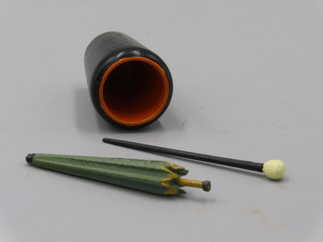Measurements: The container is 1-3/4" tall and the wooden umbrella is 2-1/2"h.