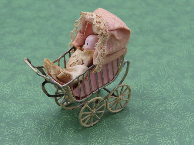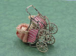 The doll carriage has pink lining and a pink hood. A small bisque doll is