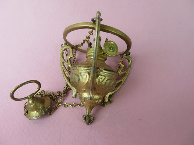 Measurements: The main part of the chandelier that holds the kerosene and rim to hold the shade etc. is 2"h. The ring around the top to hold the shade is 1-3/4" and the height from the ring at the top to the base of the font that holds the kerosene is 6-3/4" or what we call the suspension of the chandelier is 6-3/4"/