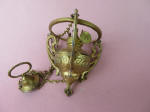 This chandelier has a great base with three brackets or holders made in the fashion of Art Nouveau. They are attached to the round rim that holds the white glass shade which is marked on the rim "Made in France". There is a gold painted line that goes around edge of the shade and then there are red strawberries or flowers drawn around the shade with some light greenery. The wick goes up and down when the knob on the side is turned. The large holder at the base of the chandelier would hold the kerosene. The chandelier, chain and holder (ring at the top) are all painted gold. A lovely piece for your collection.