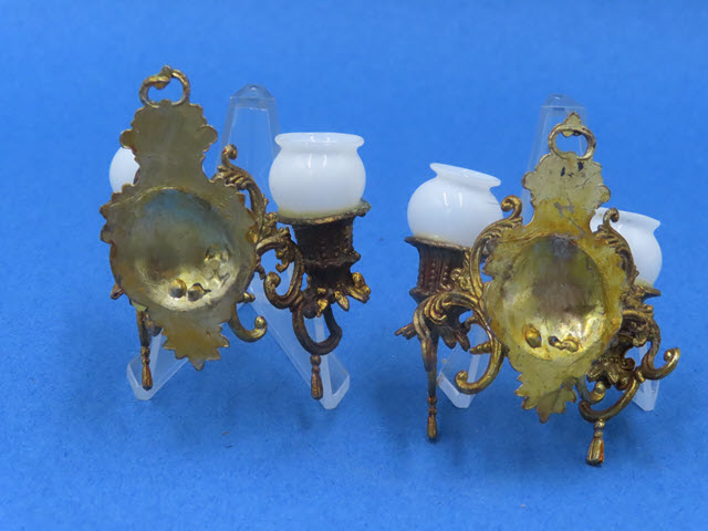 The sconces have a small opening at the back which can be nailed on to a wall. White glass globes are attached in both sockets. The sconces are made of a soft metal and painted gold. One photo shows the front of the sconces and the second photo shows how it looks from the back.