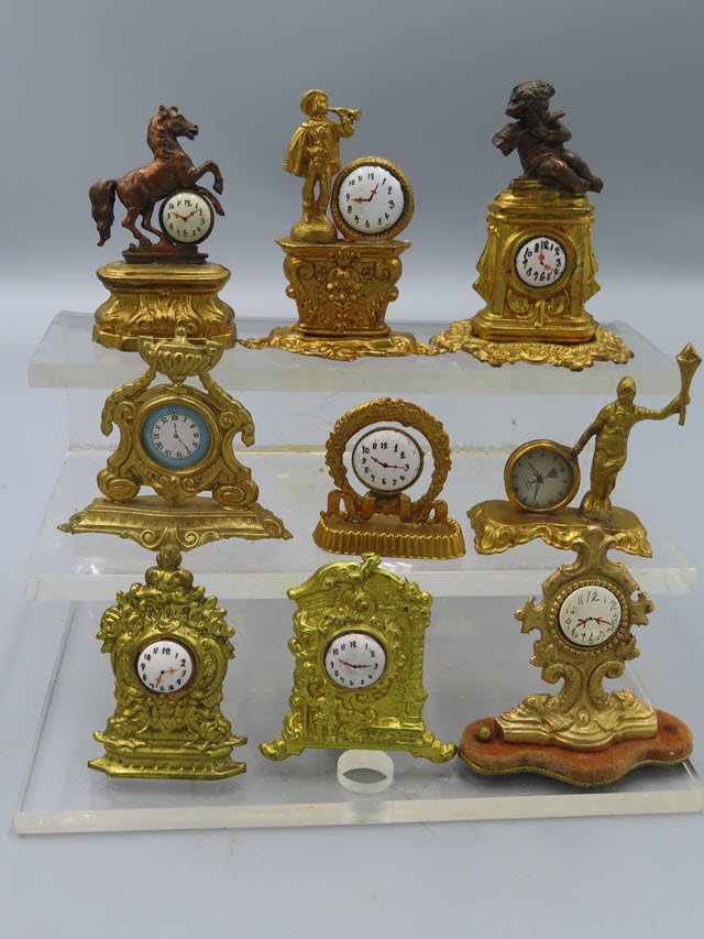 Collection of Ormolu Clocks Each measures 2" - 2-1/2" Price: Top row - $125 each! Middle/Bottom row - $100 each!