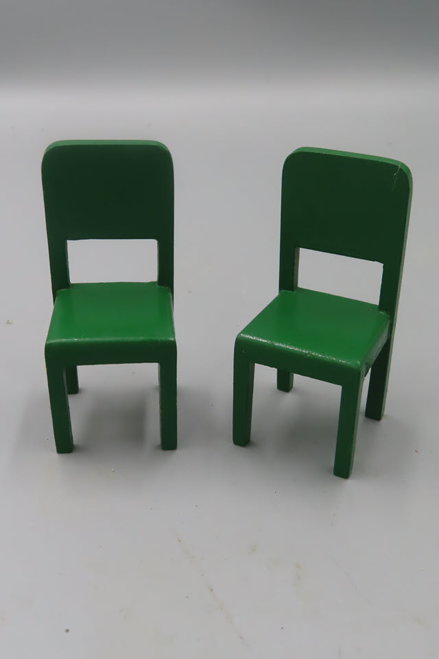 Two Green Tynietoy Chairs These two chairs were made by Tynietoy and are in mint condition. They originally were found in the maid's room in a Tynietoy dolls' house. Measurements: The chairs are 3-5/8" tall. Price: $25 each.