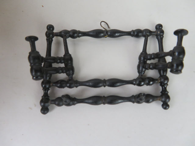 There is an amazing number of turnings in this piece! Hats can be hung on the two pieces that pull outward. Then there are 3 vertical bars that are all finely turned too. It is all painted black and has a hook on the top for hanging. A great piece to hang in a hallway.