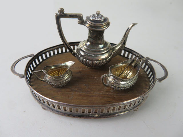 I haven't seen one of these tea sets in a long time.  The oval tray has a great railing around the sides and a wooden center. The handles are designed to be light in weight and there are 4 balls on the bottom of the tray. The teapot is large and elegant with a high spout and large handle. An abundance of raised designs are found at the base of all of the pieces, really giving more elegance. The sugar bowl has handles on the sides and is more oval shape, but it never had a cover. (This was typical in the early days as they could use a spoon or tongs to lift out sugar cubes). I have included tongs for the sugar bowl. There are many hallmarks for identification and the word "Sterling".