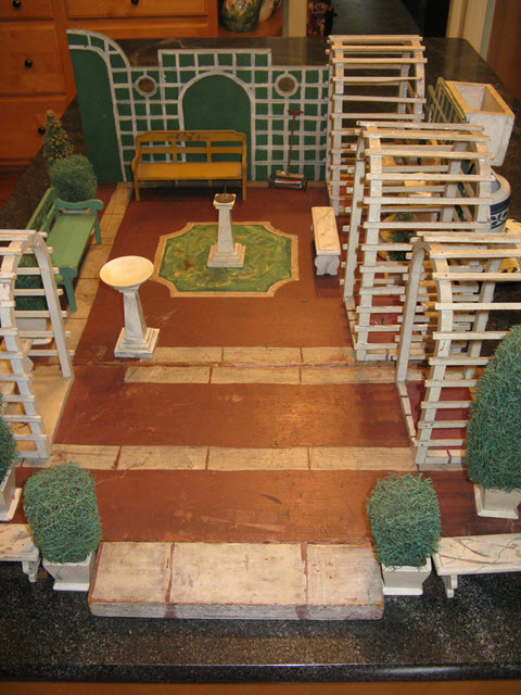 The entire Tynietoy garden is shown here! We can view the shrubbery in pots, four trellises, the two garden settees (one in tan and the other in green),