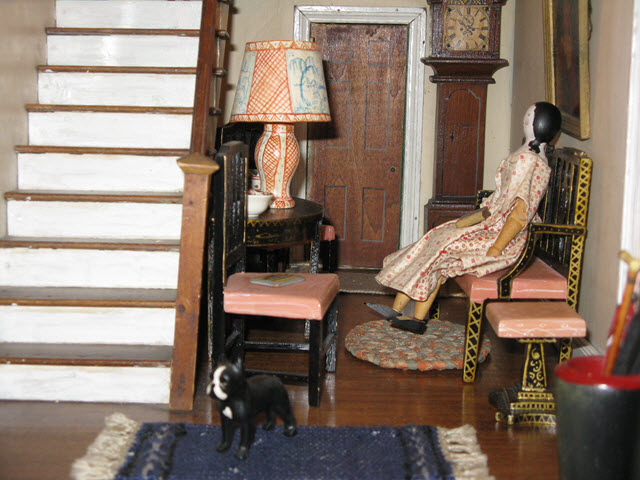 to see the gold decoration on the furniture which we discussed earlier as Japanned furniture. A peggity doll is sitting on the settee and a
