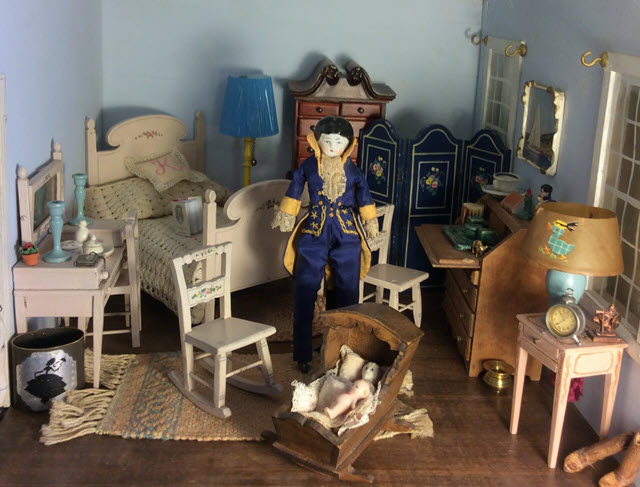 with a duck on the shade. The doll is going to a costume party and is dressed as Napoleon!