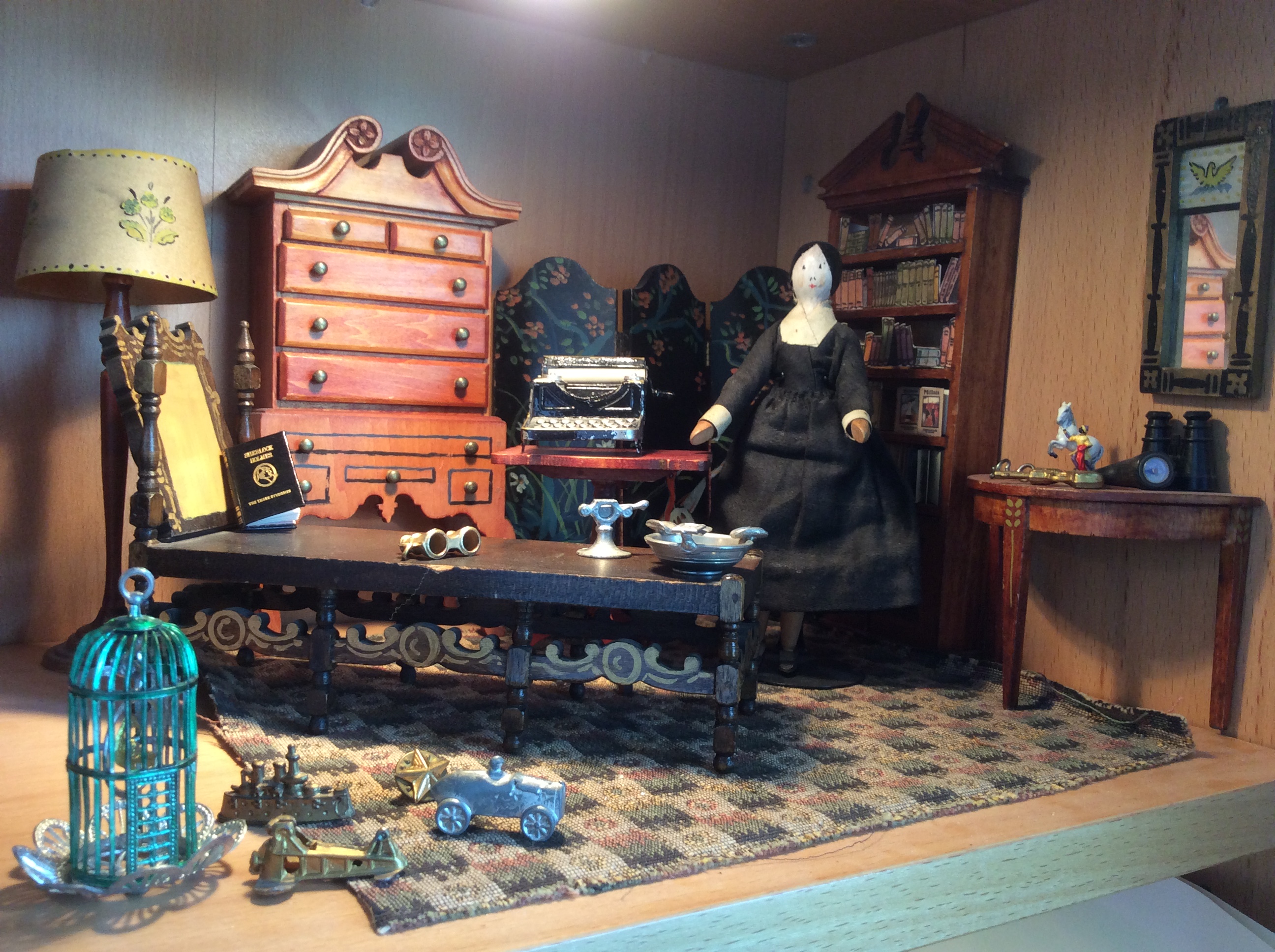 a bookcase for Sherlock to use and the we see eyeglasses, and a book by Sherlock on the chaise! We can’t forget the wonderful Peggity doll standing amongst all these Tynietoy furnishings!