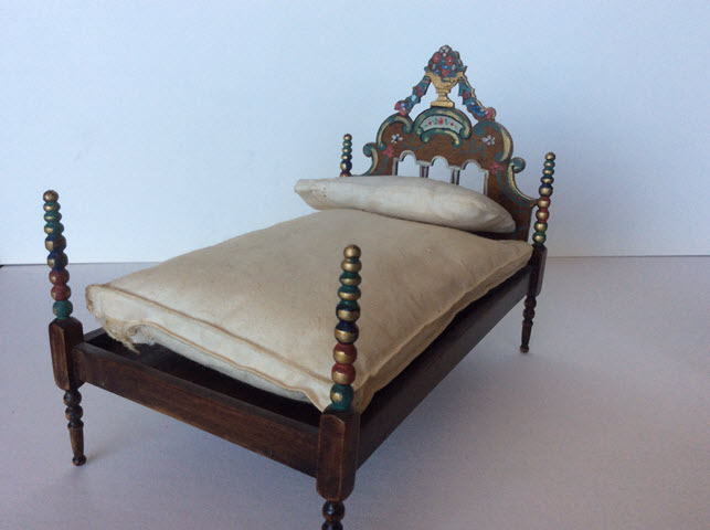 The Spanish bed has beaded posts and the headboard has a painted urn with cascading flowers flowing out of the urn and down the sides.