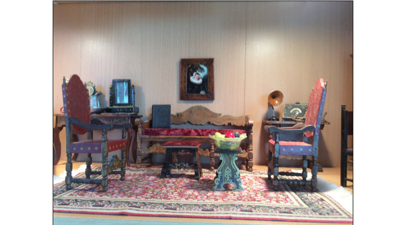 A Spanish Parlor- Here we see the Spanish sofa with the velvet cushion, the two Spanish foot stools and the pair of high back Spanish Library chairs.