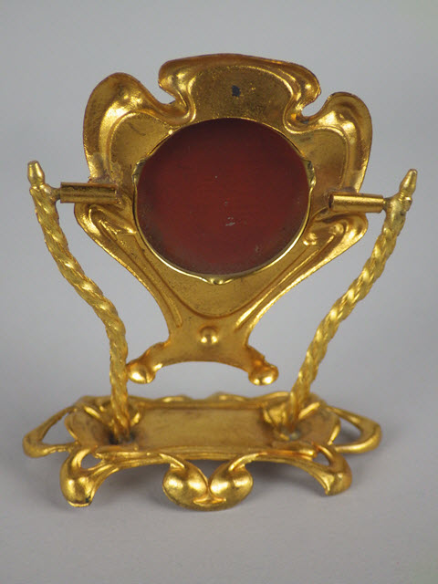 This elegant mirror is surrounded by angular forms that are typical of the Art Nouveau period. The swivel mirror is suspended between two curved posts that have a rope/like design that are mounted into a base. The base has the same angular forms in a smaller scale that surround the tray/like base. The ormolu on this piece is strong and brilliant An outstanding example of one of the finest styles in the Art Nouveau period.