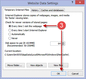 3. Under ‘check for newer versions of stored pages’, select Every time I visit the webpage and then click OK.