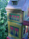This lithograph two room doll's house has the look of a Bliss house and was made about the same time as Bliss, but the maker is unknown. What makes it different from a Bliss besides the different lithography papers, is the molding that appears where the gutters on a full size house would be. Thus, the term "Gutter Houses" has been coined to these houses. The lithograph papers on the main part of the house are very nice; clear and crisp. (The base and the dormers have missing papers and the base is over-painted). Tan paper appears on three sides of the house with lined bricks on the first floor and a combination of brick and shingles on the second floor. The trim work is done in a dark green. All the windows that have lithograph paper of curtains and shades which are found on three sides of the house. The two open windows on the first floor in the front have isinglass glass and curtains.
