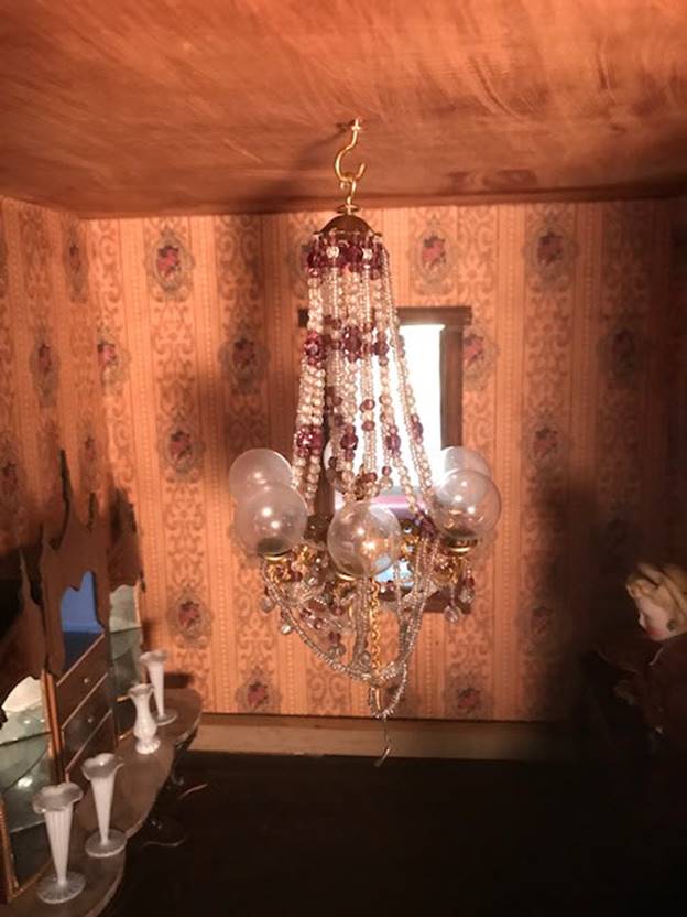 others hang father away from the center. Swags of beads hang from globe to