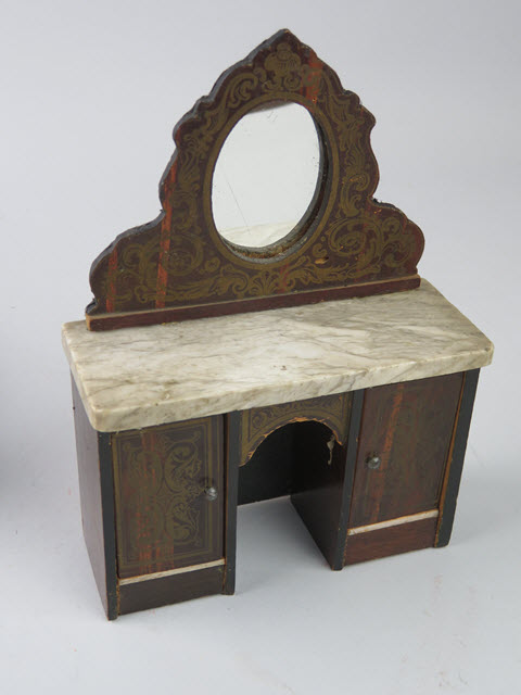 I would say this is a smaller scale piece. The oval mirror is framed with a scalloped border and wood around it to form a piece that can be glued to the back of the marble top. So the mirror is a standing piece glued to the marble top. Beneath the marble top are flanking cabinets with gold transfer work. A very nice piece!