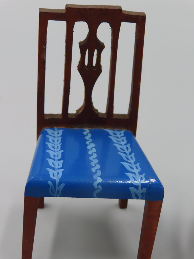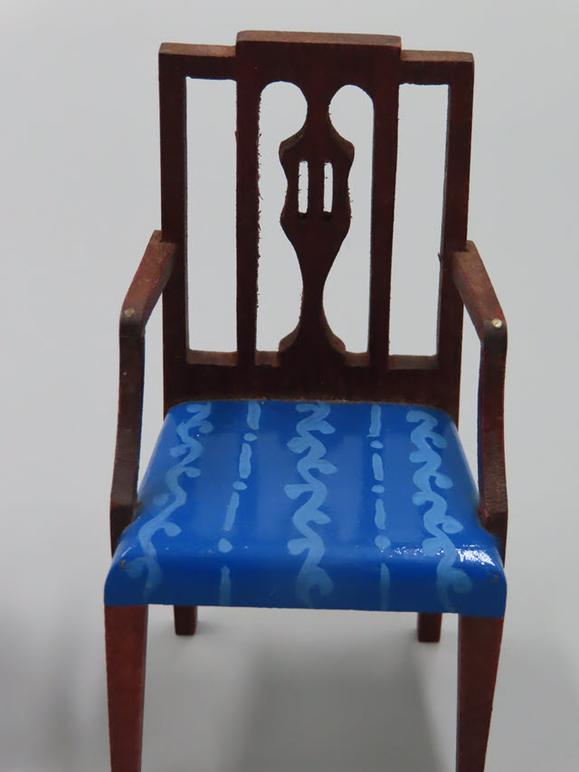 lighter blue design. All of the woodwork is done in a mahogany stain.