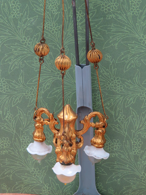 hangs and looks inside a dolls' house. This three part chandelier is hung with