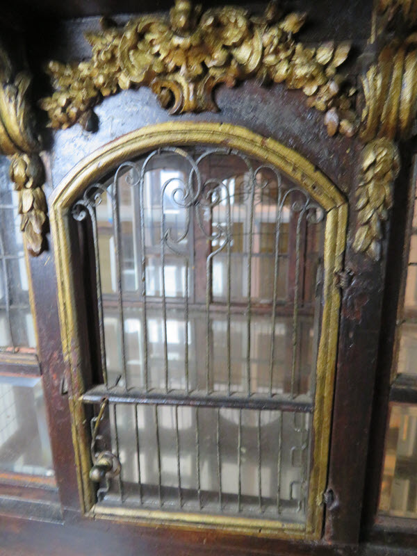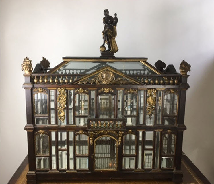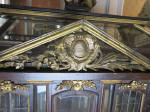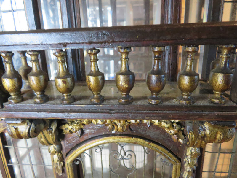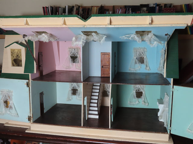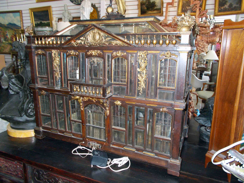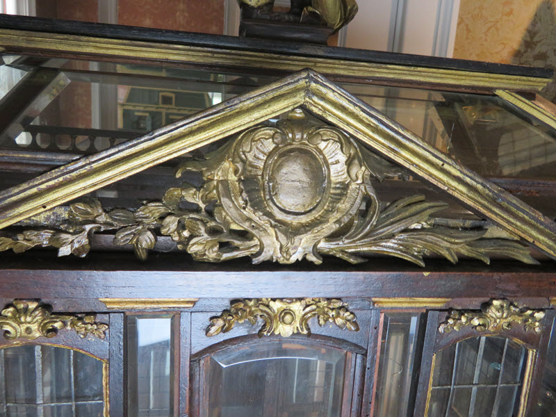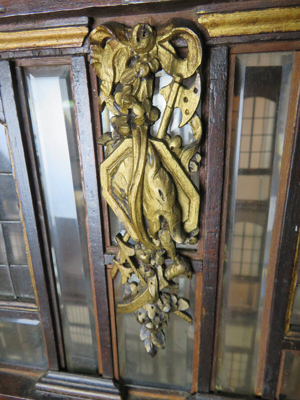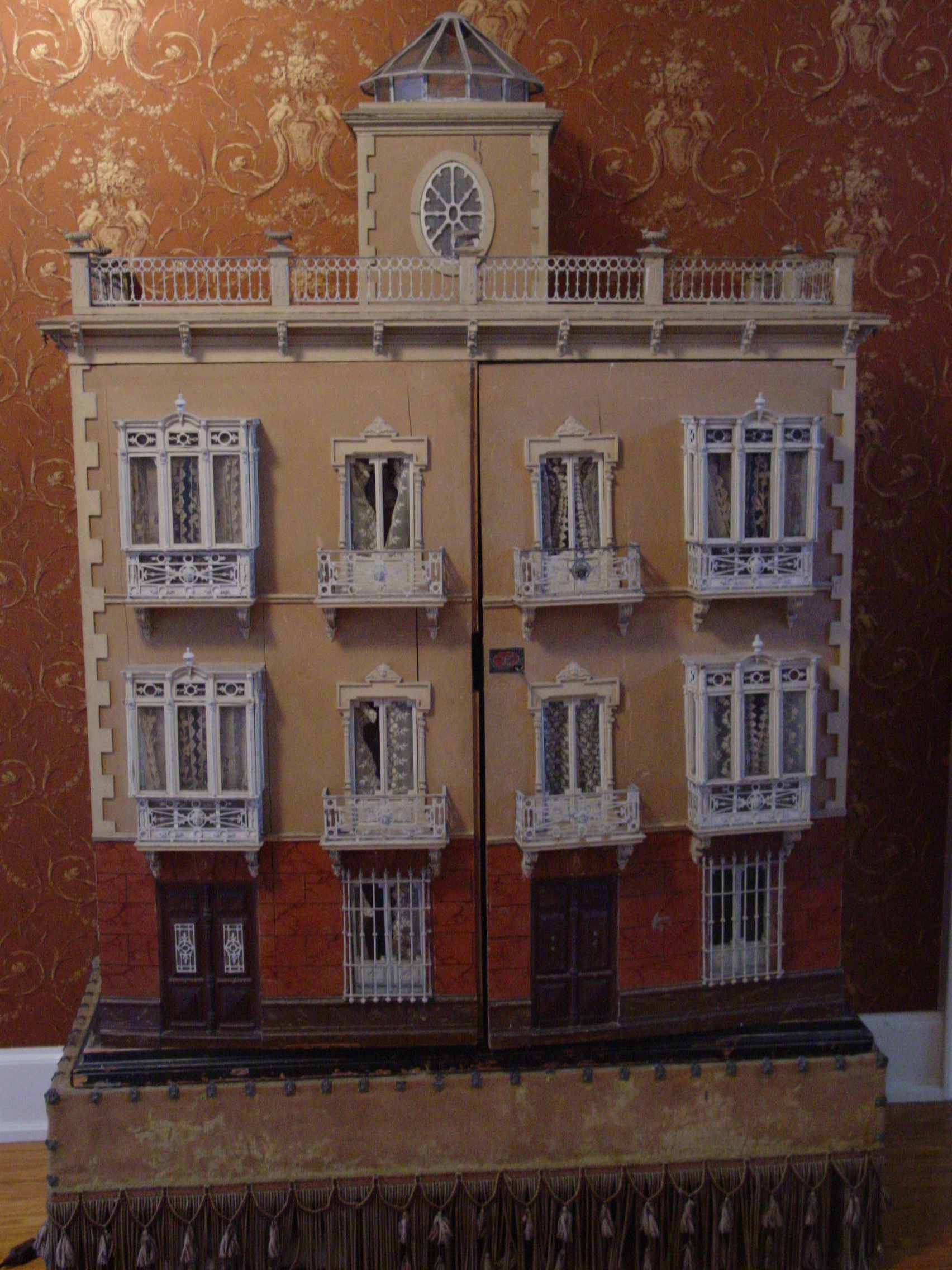 As a recent buyer of this house, I'm not familiar with its history or its actual age. The last time I saw this house, it was displayed at Lucy's Dolls' House Shop in Camden, Maine, when I visited a number of years ago. Each time I approach this house in my living room to get a better view, I discover additional openings or details I hadn't noticed before. All of the ornamentation is carved wood, painted gold. The carving work is so amazing I have photographed each of these fine pieces that you see painted gold. Incidentally, since the back of the house is made exactly like the front façade of the house, one enters through the front door (first floor) or you'd enter through the same door in the back. The side panels of windows pull out to enter the second floor on both the right side and left side.