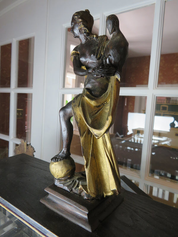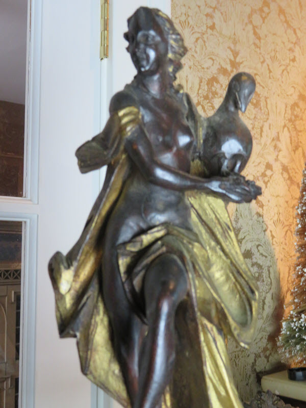 The roof is framed in dark wood that matches the rest of the house. Glass slanted panels are set in –one long one in the front and back. The sides have smaller panels of slanted glass. The very top of the house has a flat board to support the grand statue of a woman holding a pelican! The last photo shows her foot resting on a ball. The carving is just the finest carving I have ever seen with the detail of her hair and facial features!