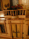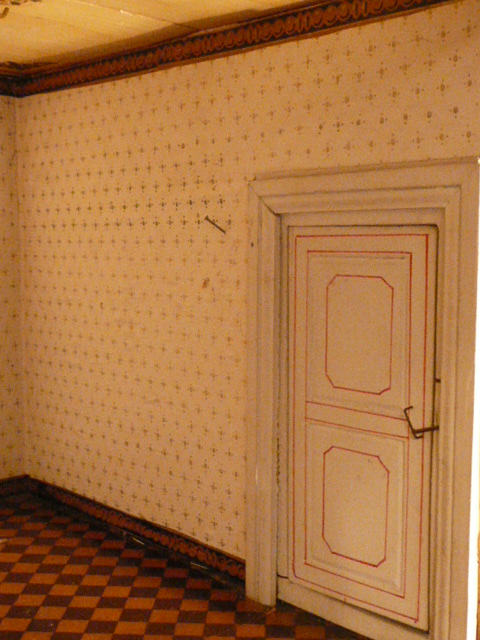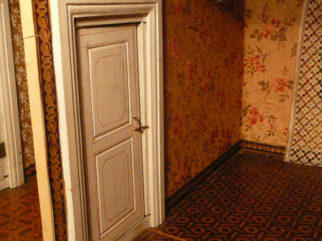 This Christian Hacker's Dolls' House is in excellent condition with its original paint and wallpapers. The exterior is painted a soft golden color with the trim work a few shades darker. All of the window treatment and painted decoration is as clear as if it were new. The raised quoining, painted lined windows, the original mansard papered roof, double door entrance with ormolu door knockers, the original curved balcony -are all intact. House opens from the front to reveal 4 main rooms and two halls with a staircase and railing. The 3rd story is removable and contains two rooms with original wall and floor papers. The main part of the house has all its original wall and floor papers, original curtains with papered borders over each wooden bracket, painted ceiling medallions, and inter-connecting doors with butterfly knobs making it possible to lock each door. Kitchen has a built in stove unit (stove is a block of wood with red brick paper) and a wonderful cupboard to display dishes. The house retains its original chimneys too. Measurements: 37"h. x 31"w.x 16-1/2"d. Circa: 1880 Price: SOLD For further information, please email me at -antiquedh@comcast.net |