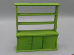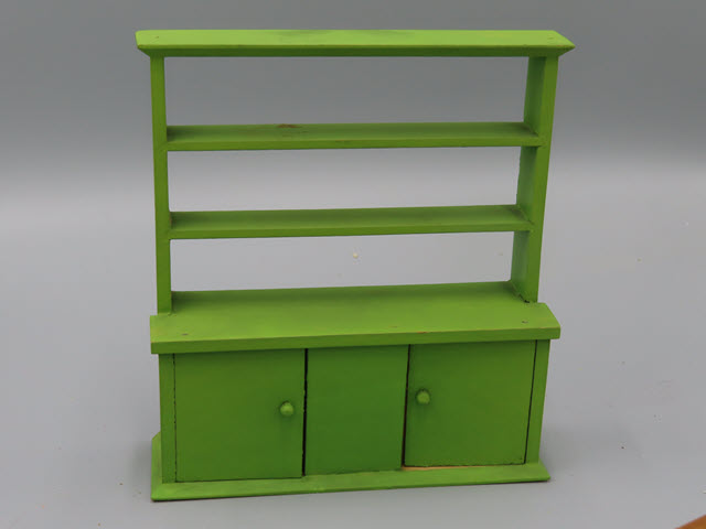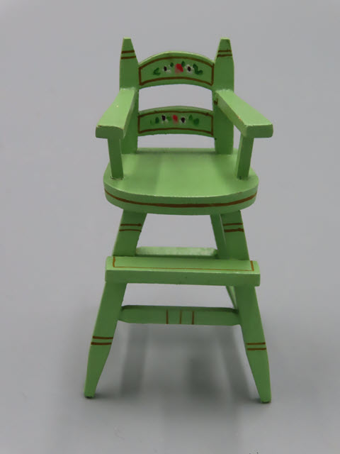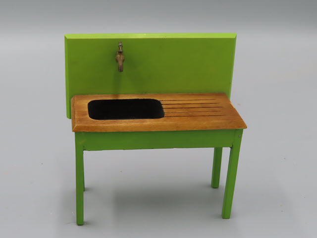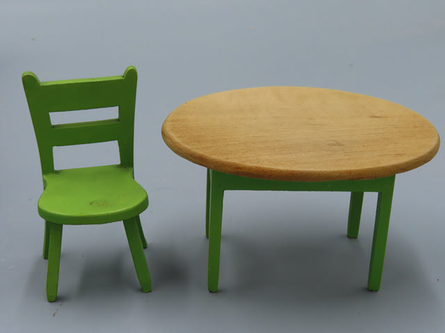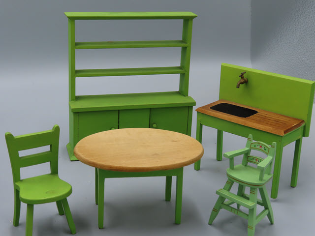 cupboard, sink, oval table, chair and high chair. All of the pieces are in