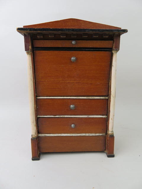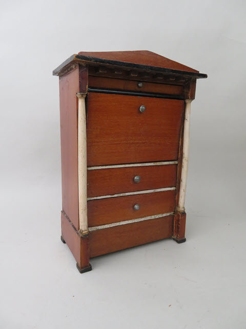 If you go into the early furniture for dolls' houses, you would see the name Kestner. Three colors are shown- the dark ebony, the light maple color and this color of the secretary – an orangey /light mahogany color. The carved white columns on the front corners, the drop front exposing a lovely interior with dentil molding at the top, several small drawers around a recessed center with a mirror. And green interior paper. A very nice piece!