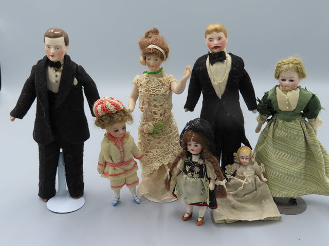 A dollhouse lady with a finely molded face with glass eyes. Her blond wig