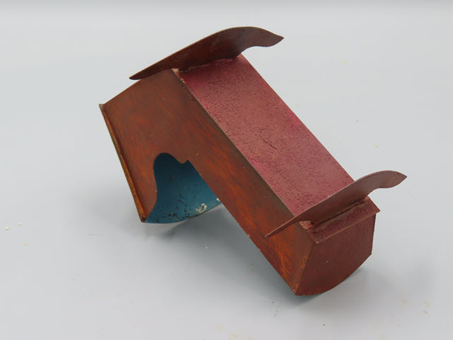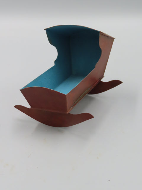 The tin cradle has a grain painted surface on the outside while the interior is