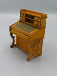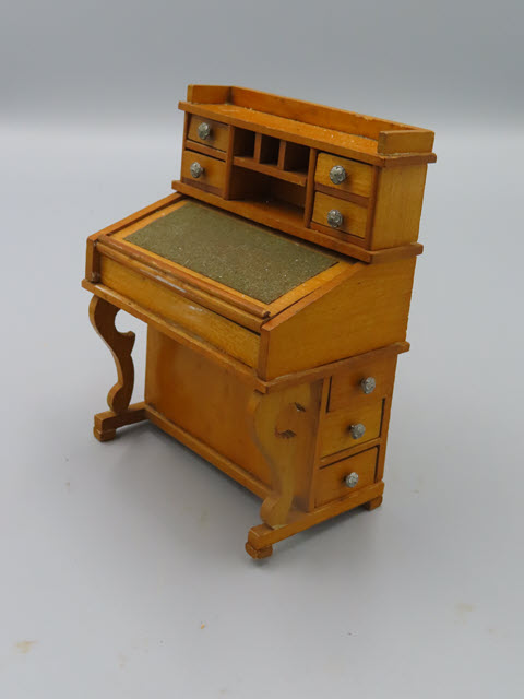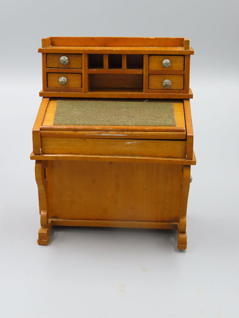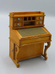 There are storage areas as seen on the sides of this desk. One side shows three drawers and on the other side is one door that opens. The top of the desk opens to store paper work. Little cubby holes are mounted on the top and then small drawers are found on each side. The scroll work on each side that helps to hold up the desk is very nicely made!