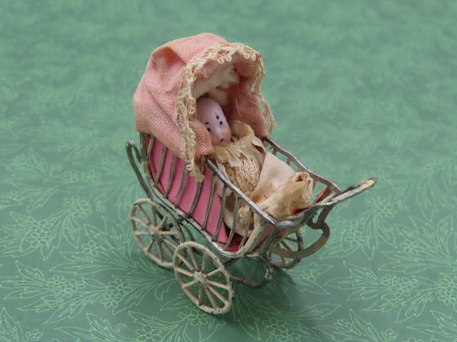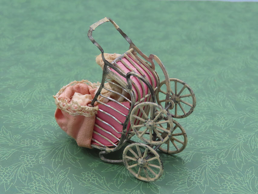 The doll carriage has pink lining and a pink hood. A small bisque doll is