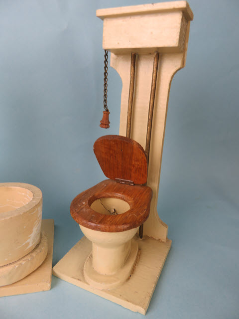 water!!! On the top of the basin is a mirror in a frame. The high tank toilet is