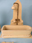 soap dishes. The basin has unusual faucets and pipes below that drain the