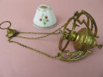 This chandelier has a great base with three brackets or holders made in the fashion of Art Nouveau. They are attached to the round rim that holds the white glass shade which is marked on the rim "Made in France". There is a gold painted line that goes around edge of the shade and then there are red strawberries or flowers drawn around the shade with some light greenery. The wick goes up and down when the knob on the side is turned. The large holder at the base of the chandelier would hold the kerosene. The chandelier, chain and holder (ring at the top) are all painted gold. A lovely piece for your collection.