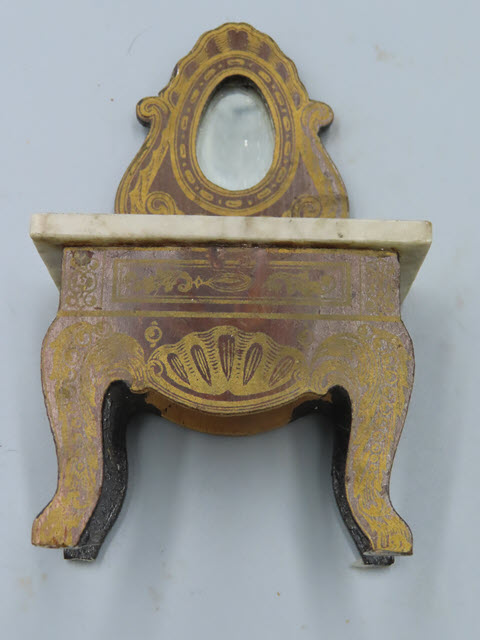 The entire piece of this dressing table has a gold design around the mirror and on the wood under the marble top.