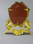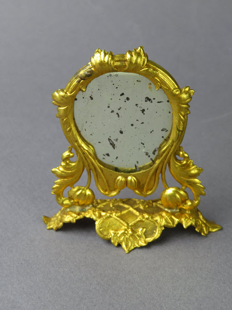 The ormolu decoration at the bottom of the mirror is really outstanding. The base has a latticed design with flowers on the tips of the stand. There are loops at the base of the mirror with stems and flowers hanging downward. On the lower sides of the mirror are large leaves that brace the mirror.