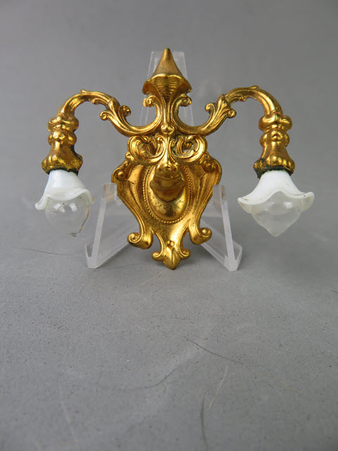 This sconce has a brilliant shine to the ormolu with two hanging lights pointed downward which is the right position. The white shades are a Bristol glass and have clear bulbs. This piece would certainly brighten up a room on a wall! (Note: I may have another one which would be very nice with one on each side of a fireplace).