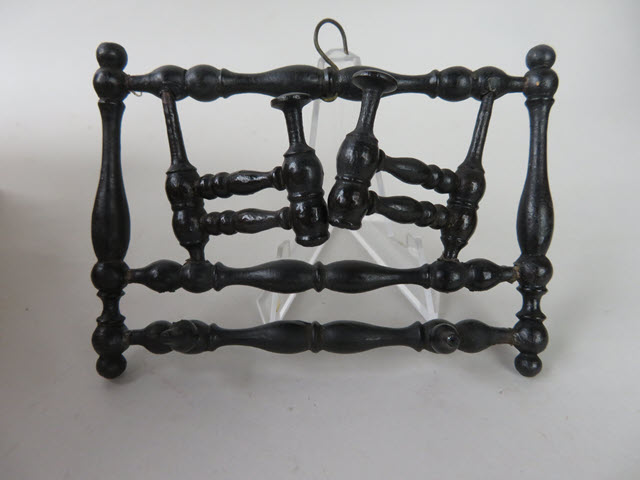There is an amazing number of turnings in this piece! Hats can be hung on the two pieces that pull outward. Then there are 3 vertical bars that are all finely turned too. It is all painted black and has a hook on the top for hanging. A great piece to hang in a hallway.
