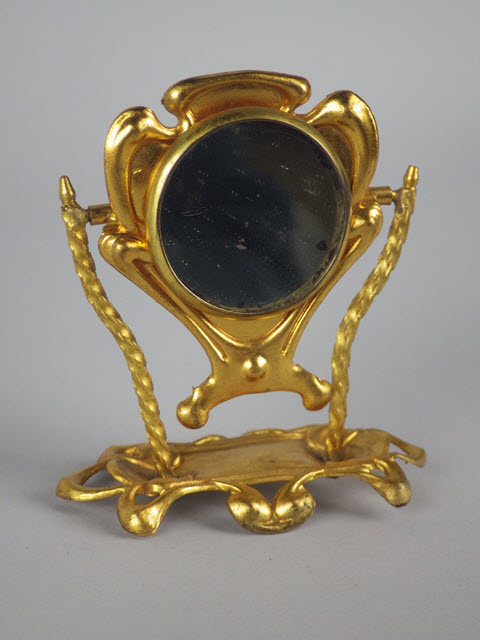 This elegant mirror is surrounded by angular forms that are typical of the Art Nouveau period. The swivel mirror is suspended between two curved posts that have a rope/like design that are mounted into a base. The base has the same angular forms in a smaller scale that surround the tray/like base. The ormolu on this piece is strong and brilliant An outstanding example of one of the finest styles in the Art Nouveau period.