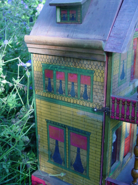 This lithograph two room doll's house has the look of a Bliss house and was made about the same time as Bliss, but the maker is unknown. What makes it different from a Bliss besides the different lithography papers, is the molding that appears where the gutters on a full size house would be. Thus, the term "Gutter Houses" has been coined to these houses. The lithograph papers on the main part of the house are very nice; clear and crisp. (The base and the dormers have missing papers and the base is over-painted). Tan paper appears on three sides of the house with lined bricks on the first floor and a combination of brick and shingles on the second floor. The trim work is done in a dark green. All the windows that have lithograph paper of curtains and shades which are found on three sides of the house. The two open windows on the first floor in the front have isinglass glass and curtains.